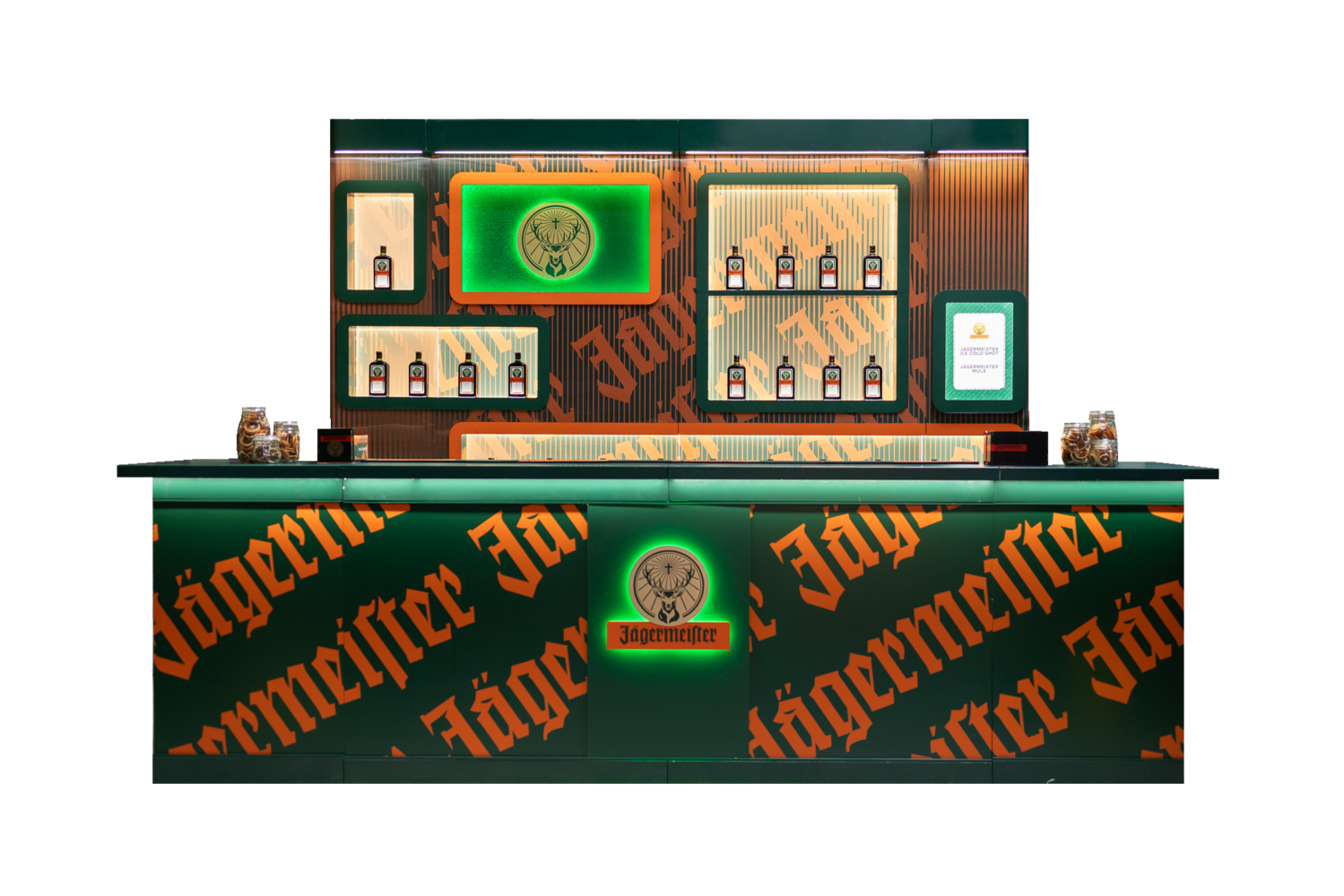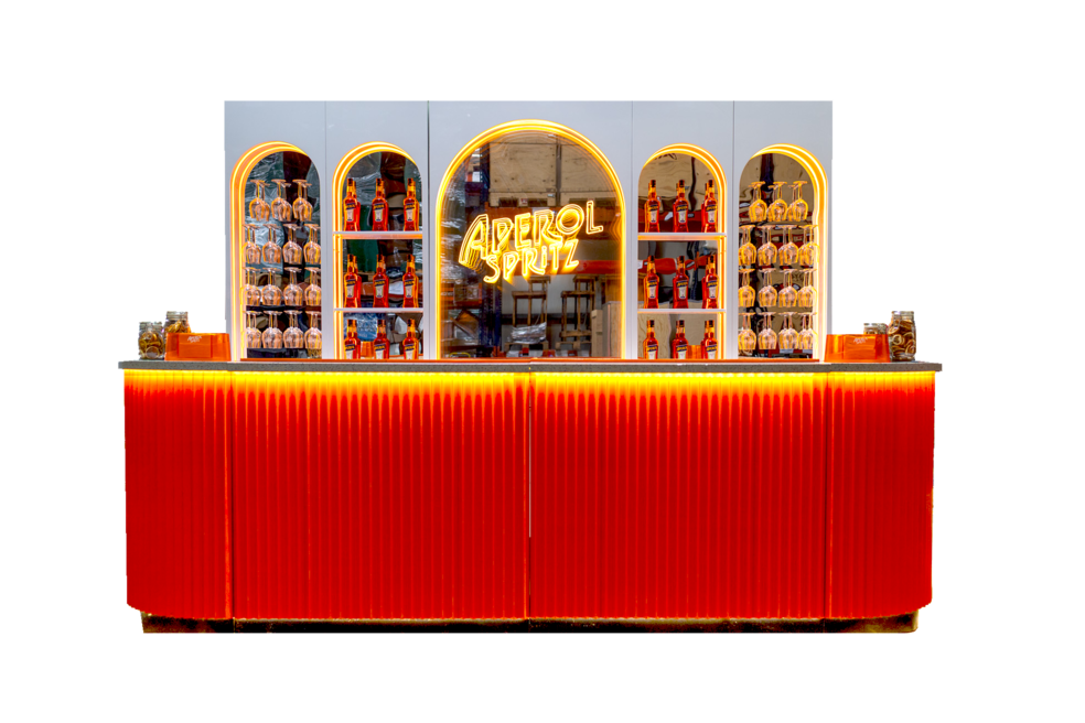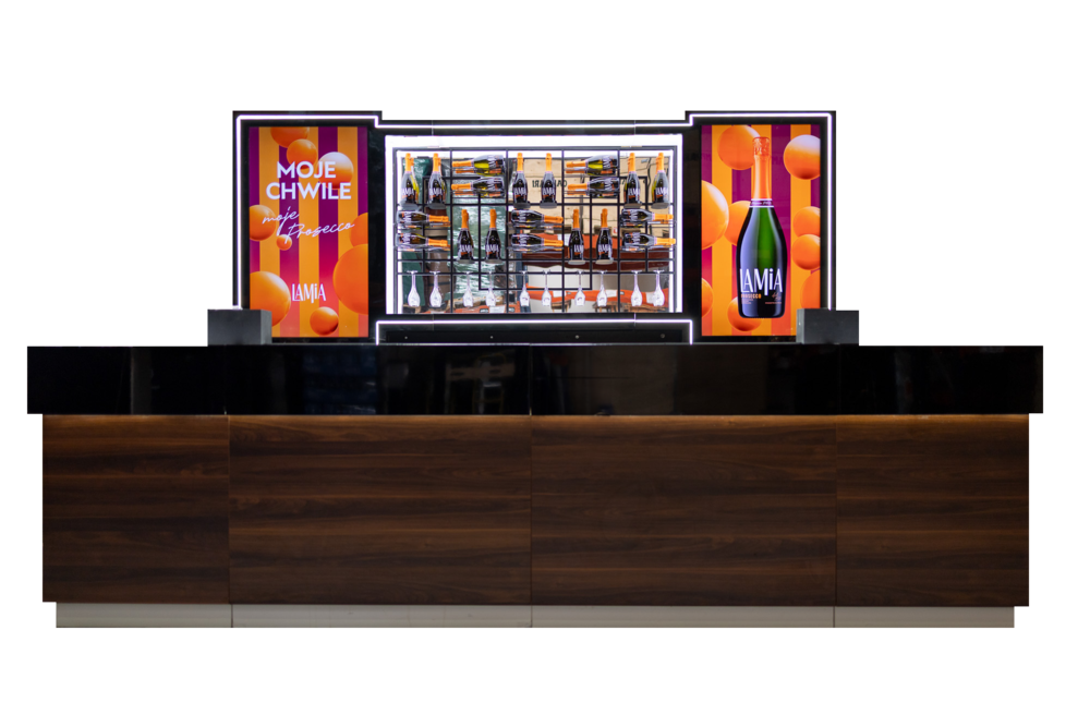 Oferujemy linie barowe H8MNDAY, na których możemy wykonać personalizowany branding – zarówno na froncie baru, jak i na ścianie za nim. Jeśli szukacie gotowych rozwiązań, mamy również bary PARTNERSKIE z przygotowanym brandingiem, które świetnie wpiszą się w atmosferę wydarzenia.